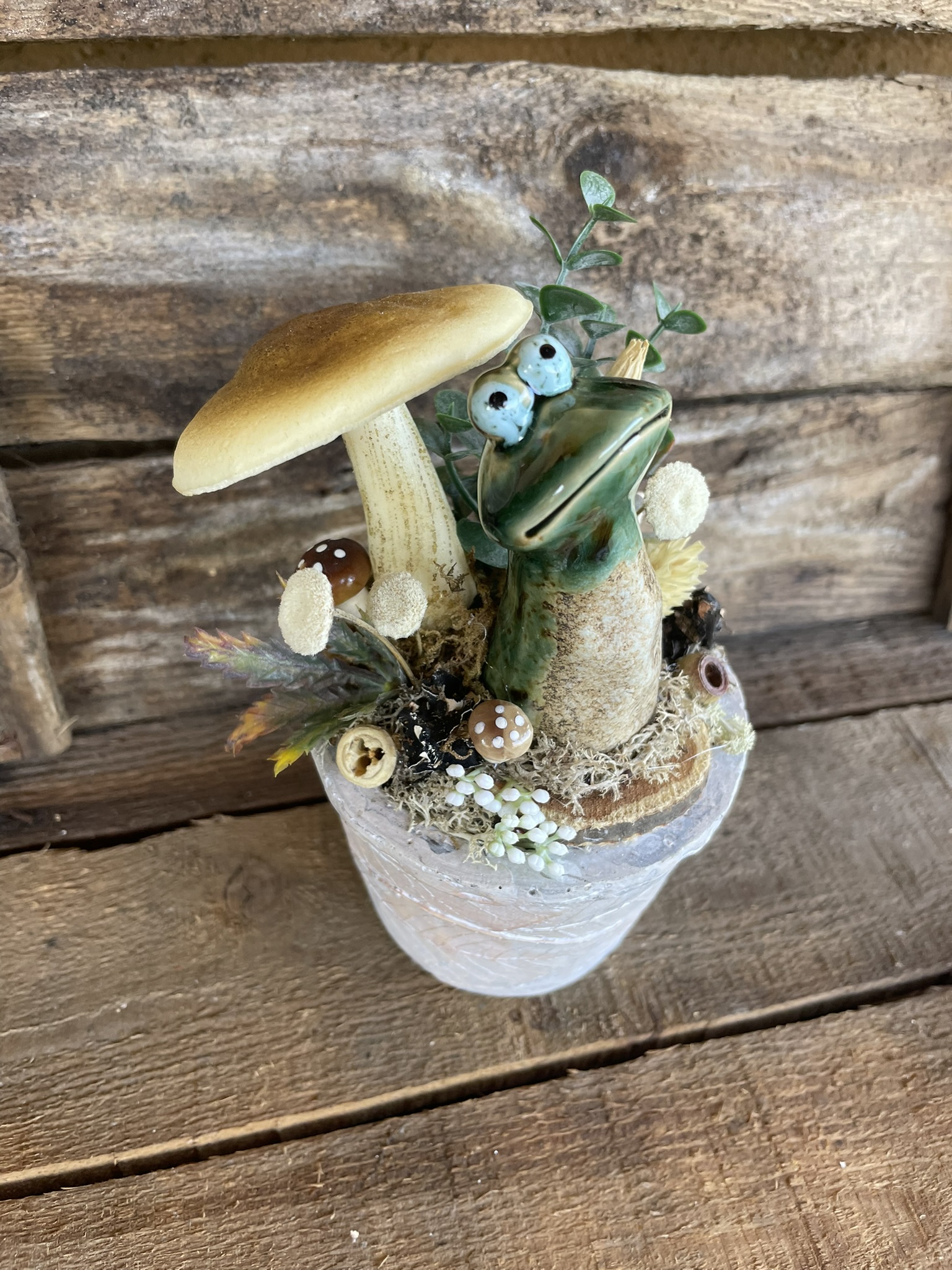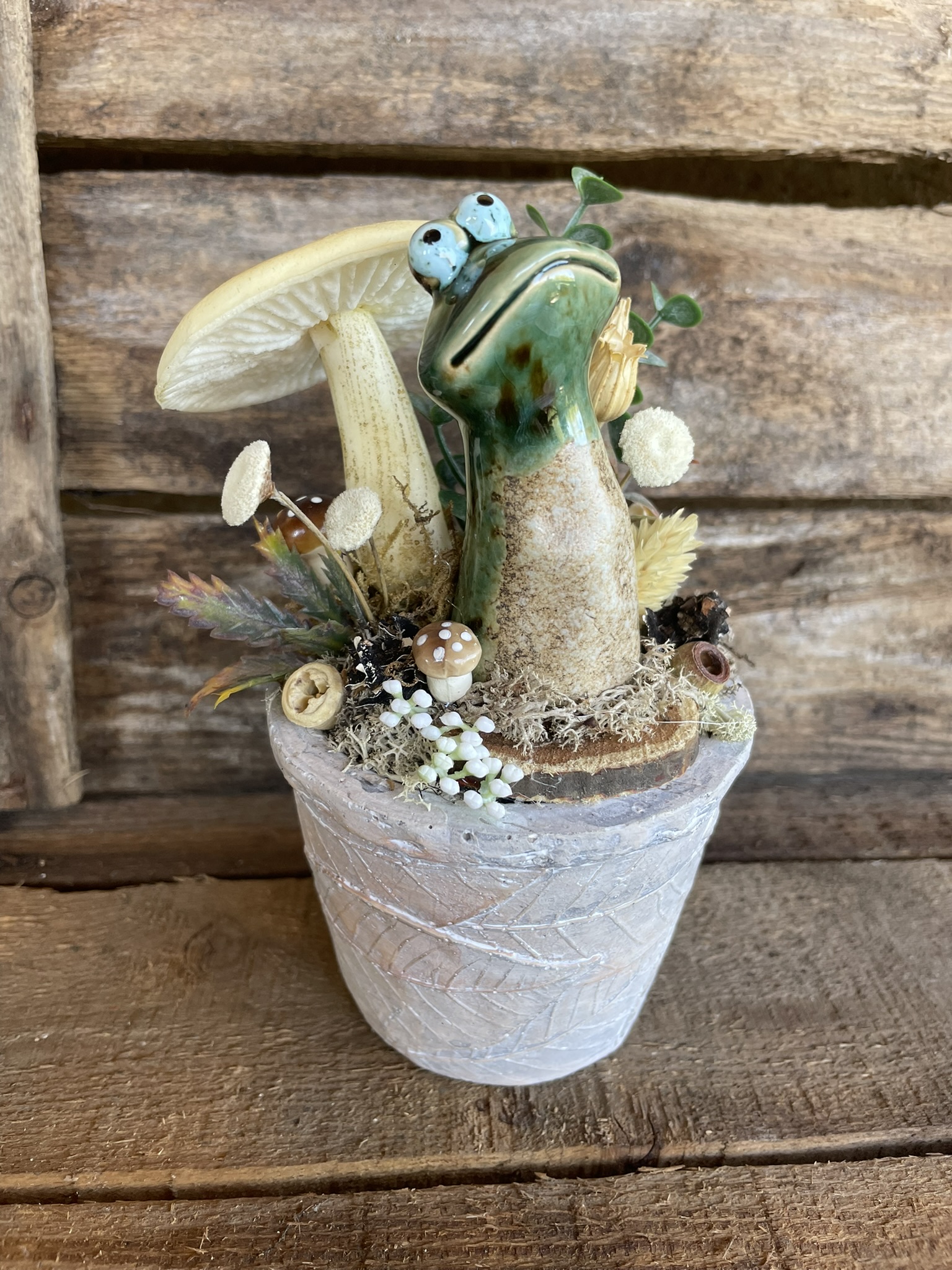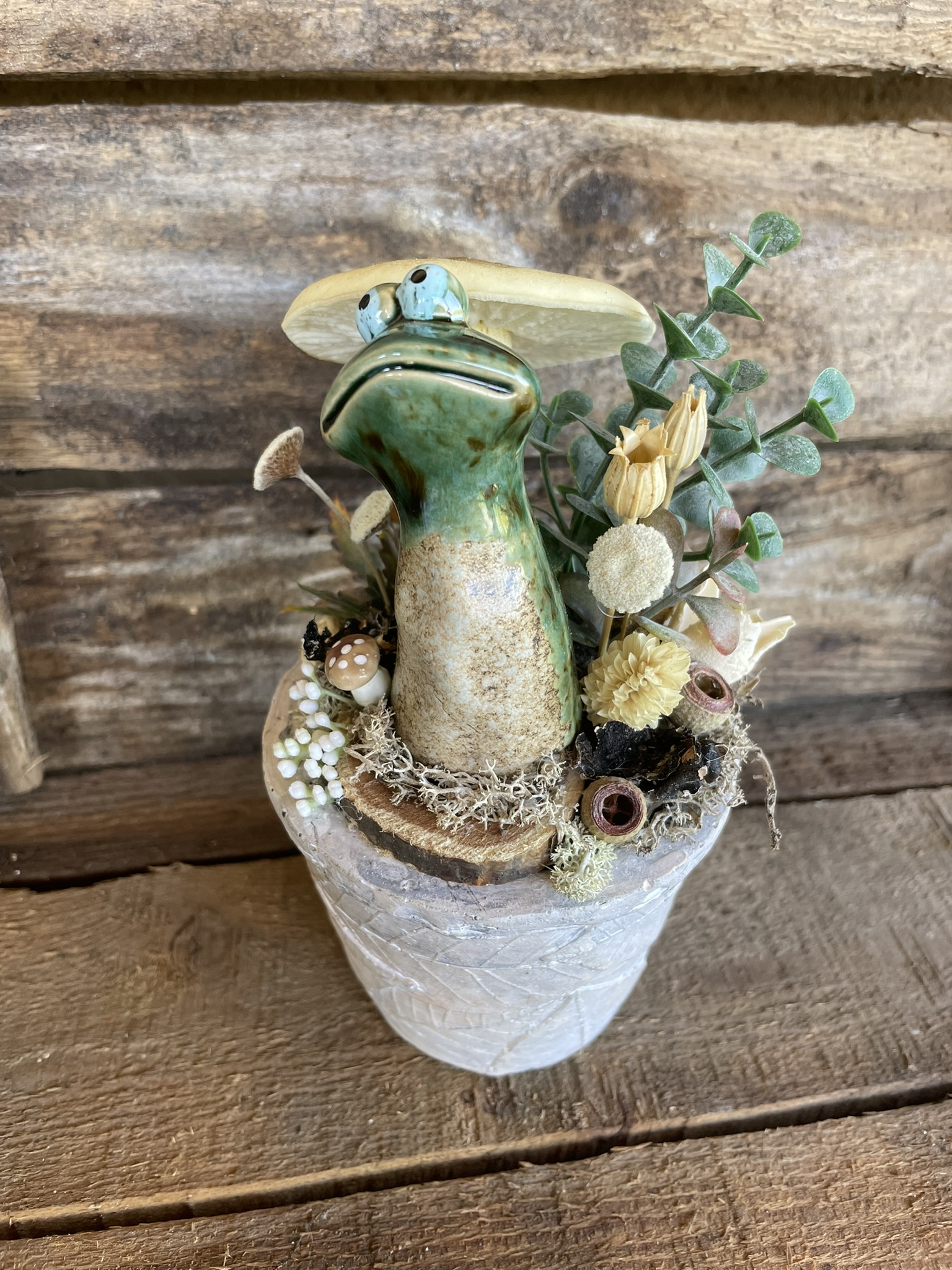 Anyag: kerámia kaspó és béka figura, habszivacs gumi gomba, szárított és műnövények