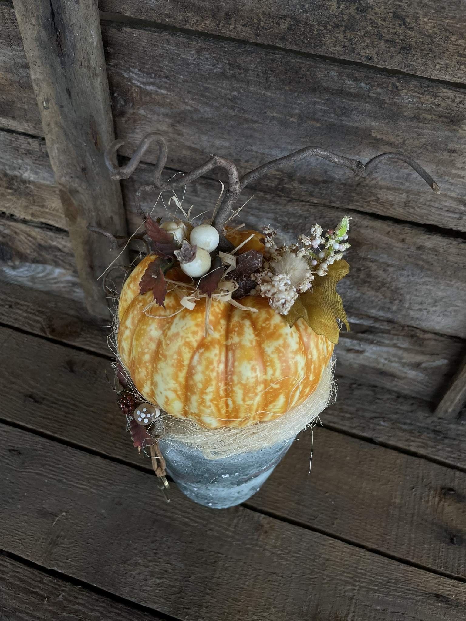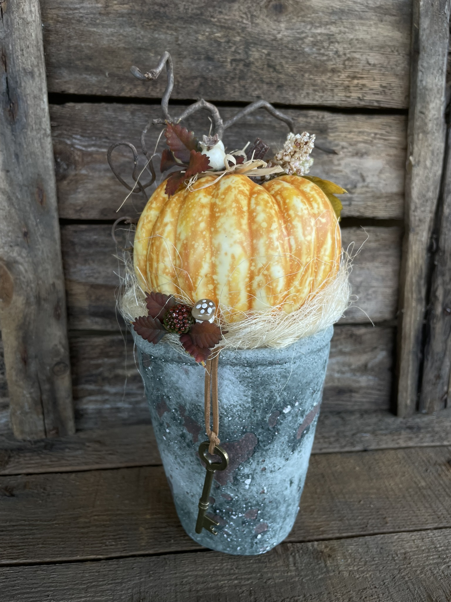 Anyag: kerámia kaspó, műanyag tök, mogyorófa ág, rézkulcs, prémium műnövények